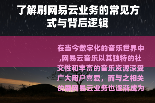 在当今数字化的音乐世界中,网易云音乐以其独特的社交性和丰富的音乐资源深受广大用户喜爱,而与之相关的刷网易云业务也逐渐成为了一个备受关注的话题。