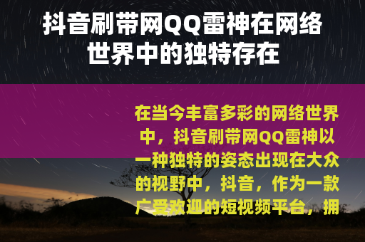 在当今丰富多彩的网络世界中,抖音刷带网QQ雷神以一种独特的姿态出现在大众的视野中,抖音,作为一款广受欢迎的短视频平台,拥有着海量的用户和丰富多样的内容,而刷带网则在一定程度上为抖音用户提供了一种别样的体验。