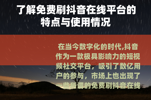 在当今数字化的时代,抖音作为一款极具影响力的短视频社交平台,吸引了数亿用户的参与,市场上也出现了一些所谓的免费刷抖音在线平台,它们以各种方式吸引着用户的关注。