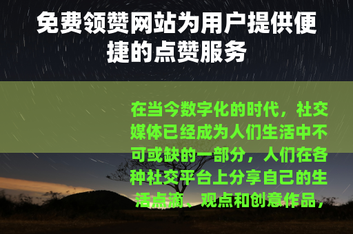 免费领赞网站的出现,满足了许多用户对于社交认可的需求,对于那些在社交媒体上努力经营自己账号的人来说,点赞数量往往是衡量其内容受欢迎程度的一个重要指标,通过在领赞网站上免费领取点赞,用户可以快速提升自己发布内容的点赞数,从而在众多的信息中脱颖而出,吸引更多人的关注,这不仅能够让用户感受到自己的努力得到了回报,还能增强他们在社交平台上的自信心和积极性。