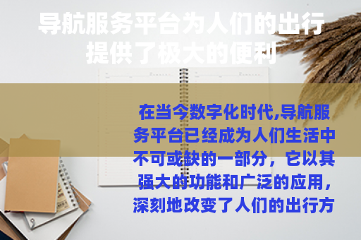 在当今数字化时代,导航服务平台已经成为人们生活中不可或缺的一部分,它以其强大的功能和广泛的应用,深刻地改变了人们的出行方式和生活习惯。