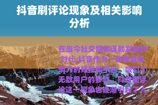 在当今社交媒体蓬勃发展的时代,抖音作为一款极具影响力的短视频平台,吸引了无数用户的参与,抖音刷评论这一现象也逐渐引起了人们的关注。