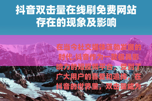 在当今社交媒体蓬勃发展的时代,抖音作为一款极具影响力的短视频平台,受到了广大用户的喜爱和追捧,在抖音的世界里,双击量成为了衡量一个视频受欢迎程度的重要指标之一,而与之相关的,抖音双击量在线刷免费网站也应运而生,引发了一系列值得关注的现象和影响。