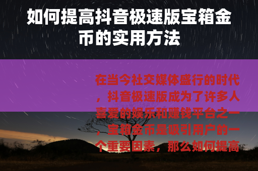 在当今社交媒体盛行的时代,抖音极速版成为了许多人喜爱的娱乐和赚钱平台之一,宝箱金币是吸引用户的一个重要因素,那么如何提高抖音极速版宝箱金币呢?以下是一些实用的方法。