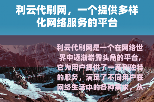 利云代刷网以其丰富的服务种类、良好的用户体验、合理的价格和可靠的安全保障,在网络服务领域占据了一席之地,为广大用户提供了便捷、高效的网络服务解决方案,满足了用户在社交、电商、游戏等多个方面的需求,成为了众多用户在网络生活中的得力助手,它不断创新和完善自身的服务,致力于为用户带来更好的体验,在未来的发展中有着广阔的前景。