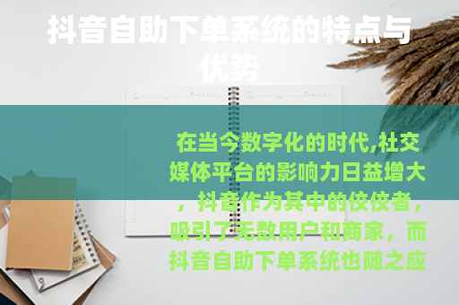 在当今数字化的时代,社交媒体平台的影响力日益增大,抖音作为其中的佼佼者,吸引了无数用户和商家,而抖音自助下单系统也随之应运而生,为用户和商家带来了诸多便利和新的机遇。