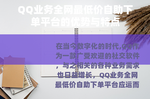 QQ业务全网最低价自助下单平台是一个具有重要价值和广阔发展前景的平台,它以其价格优势、自助下单模式、丰富业务种类和优质服务质量等特点,赢得了广大用户的喜爱和认可,在未来的发展中,它将不断借助新技术的力量,不断创新和融合,为用户创造更加丰富、便捷、个性化的数字生活体验,成为互联网服务领域的一颗璀璨明珠,为推动数字经济的发展和社会的进步做出积极的贡献。