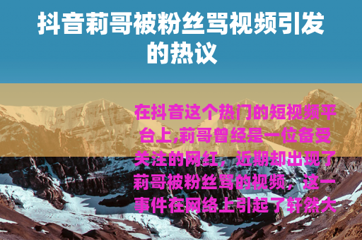 在抖音这个热门的短视频平台上,莉哥曾经是一位备受关注的网红,近期却出现了莉哥被粉丝骂的视频,这一事件在网络上引起了轩然大波。