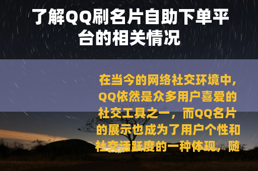 在当今的网络社交环境中,QQ依然是众多用户喜爱的社交工具之一,而QQ名片的展示也成为了用户个性和社交活跃度的一种体现,随着网络技术的发展,出现了QQ刷名片自助下单平台,为用户提供了一种快速提升名片点赞、访客量等数据的途径。