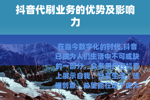 在当今数字化的时代,抖音已成为人们生活中不可或缺的一部分,众多用户在抖音上展示自我、分享生活、传播创意,希望能在这个庞大的平台上获得更多的关注和认可,而在这个过程中,抖音代刷业务逐渐兴起,并展现出其独特的优势,堪称最牛。
