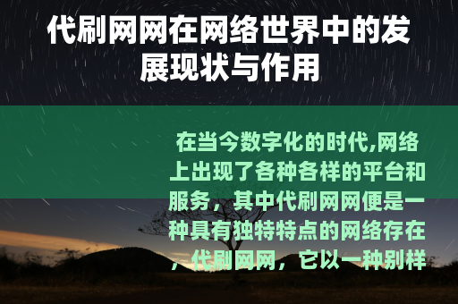在当今数字化的时代,网络上出现了各种各样的平台和服务,其中代刷网网便是一种具有独特特点的网络存在,代刷网网,它以一种别样的方式在网络的广阔天地中占据了一席之地。