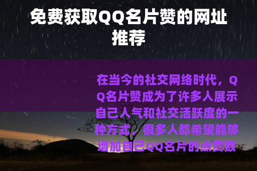 在当今的社交网络时代,QQ名片赞成为了许多人展示自己人气和社交活跃度的一种方式,很多人都希望能够增加自己QQ名片的点赞数量,让自己在好友列表中更加突出,而如今,网络上出现了一些声称可以提供免费QQ刷名片赞的网址,为广大QQ用户带来了新的途径。