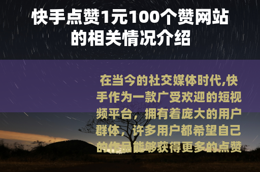 在当今的社交媒体时代,快手作为一款广受欢迎的短视频平台,拥有着庞大的用户群体,许多用户都希望自己的作品能够获得更多的点赞,以此来增加作品的热度和曝光度,而在网络上,也出现了一些声称可以提供快手点赞服务的网站,其中就有所谓的快手点赞1元100个赞的网站。