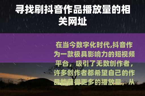 在当今数字化时代,抖音作为一款极具影响力的短视频平台,吸引了无数创作者,许多创作者都希望自己的作品能获得更多的播放量,从而提升知名度和影响力,一些人开始寻找刷抖音作品播放量的途径,其中刷抖音作品播放最便宜网址就成为了一个热门话题。