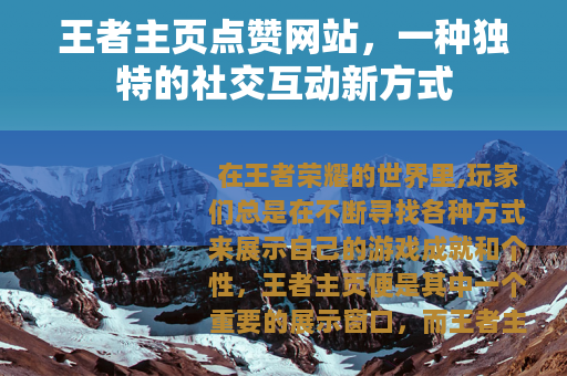 在王者荣耀的世界里,玩家们总是在不断寻找各种方式来展示自己的游戏成就和个性,王者主页便是其中一个重要的展示窗口,而王者主页点赞网站的出现,为玩家们提供了一个全新的社交互动途径,让王者峡谷中的社交氛围变得更加热烈和丰富。