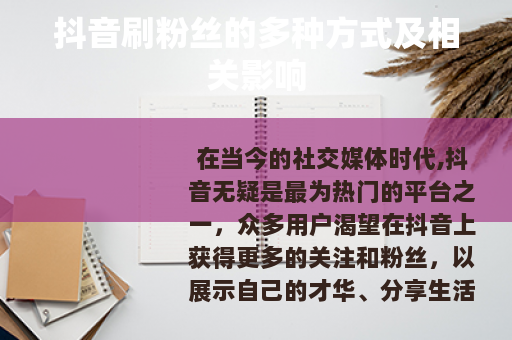 在当今的社交媒体时代,抖音无疑是最为热门的平台之一,众多用户渴望在抖音上获得更多的关注和粉丝,以展示自己的才华、分享生活点滴或推广自己的产品与服务,而抖音刷粉丝这一现象也随之出现并逐渐受到人们的关注。