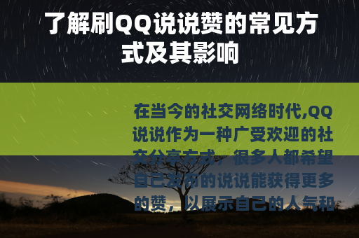 在当今的社交网络时代,QQ说说作为一种广受欢迎的社交分享方式,很多人都希望自己发布的说说能获得更多的赞,以展示自己的人气和关注度,刷QQ说说赞也因此成为了一个热门话题。