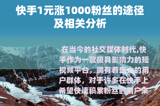 在当今的社交媒体时代,快手作为一款极具影响力的短视频平台,拥有着庞大的用户群体,对于许多在快手上希望快速积累粉丝的用户来说,找到一种高效且低成本的涨粉方式成为了他们关注的重点。“快手1元涨1000粉丝”这样的说法在一些网络渠道中悄然兴起,引起了不少人的兴趣。