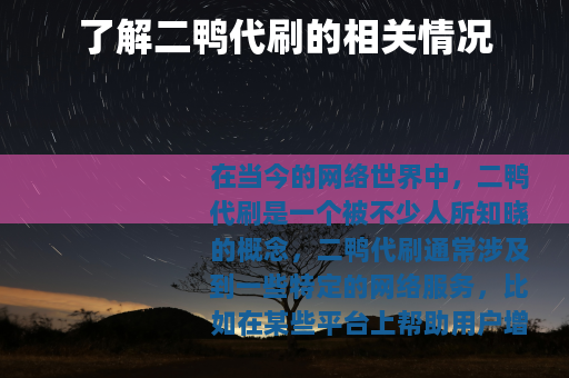 在当今的网络世界中,二鸭代刷是一个被不少人所知晓的概念,二鸭代刷通常涉及到一些特定的网络服务,比如在某些平台上帮助用户增加粉丝数量、点赞量、评论量等数据。