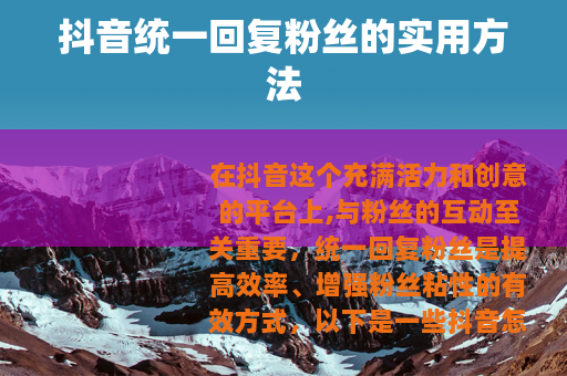 在抖音这个充满活力和创意的平台上,与粉丝的互动至关重要,统一回复粉丝是提高效率、增强粉丝粘性的有效方式,以下是一些抖音怎么统一回复粉丝的实用技巧。