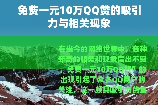 在当今的网络世界中,各种新奇的服务和现象层出不穷,免费一元10万QQ赞”的出现引起了众多QQ用户的关注,这一颇具吸引力的宣传,让许多人对其产生了浓厚的兴趣。
