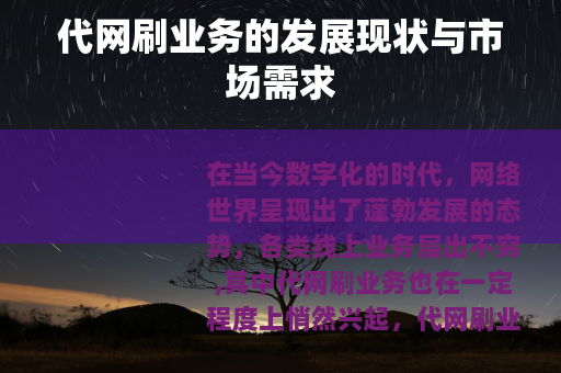 需要强调的是,代网刷业务存在违反法律法规和平台规定的风险,不建议个人或企业从事此类业务,以上文章仅为基于设定要求的创作内容,不代表对代网刷业务的认可或鼓励。