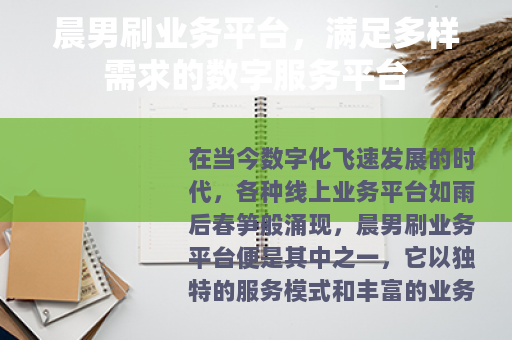 在当今数字化飞速发展的时代,各种线上业务平台如雨后春笋般涌现,晨男刷业务平台便是其中之一,它以独特的服务模式和丰富的业务种类,在众多平台中崭露头角,为用户提供了一系列便捷的解决方案。