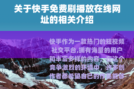 虽然“快手免费刷播放在线网址”可能在表面上看起来是一种快速提升播放量的捷径,但实际上却存在着诸多风险和弊端,创作者们应该秉持诚信和创新的原则,通过合法合规、积极有效的方式来提高自己作品的质量和传播力,从而在快手平台上获得真正的发展和成功。