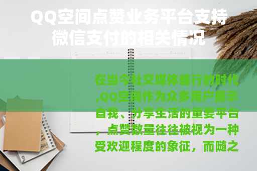 QQ空间点赞业务平台支持微信支付是社交媒体发展和互联网经济背景下的一种现象,它既为用户提供了一种提升QQ空间影响力的方式,也为平台的运营和发展带来了机遇,但在享受这种便利的同时,用户和平台都需要共同努力,确保交易的安全和服务的质量,以实现互利共赢的局面,让QQ空间点赞业务在健康、有序的轨道上发展,为用户带来更多的价值和乐趣。