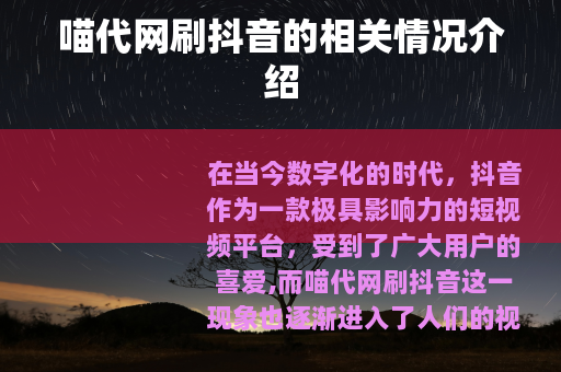 在当今数字化的时代,抖音作为一款极具影响力的短视频平台,受到了广大用户的喜爱,而喵代网刷抖音这一现象也逐渐进入了人们的视野。