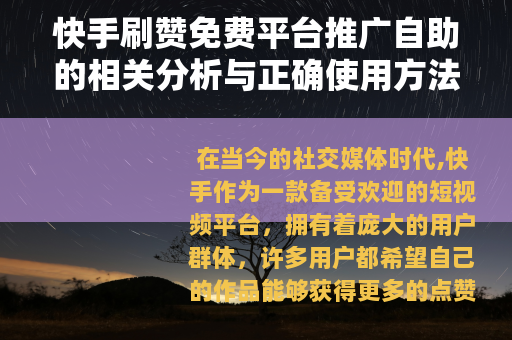 快手刷赞免费平台推广自助在一定程度上为用户提供了便利和机会,但也需要用户理性对待和正确使用,只有在遵守平台规则、注重作品质量的前提下,才能充分发挥其优势,实现自己在快手平台上的发展目标,为自己的短视频创作之路增添光彩,快手平台和相关的刷赞平台也需要共同努力,营造一个健康、有序、积极的网络环境,让快手这个短视频平台能够持续繁荣发展,为广大用户带来更多的乐趣和价值。