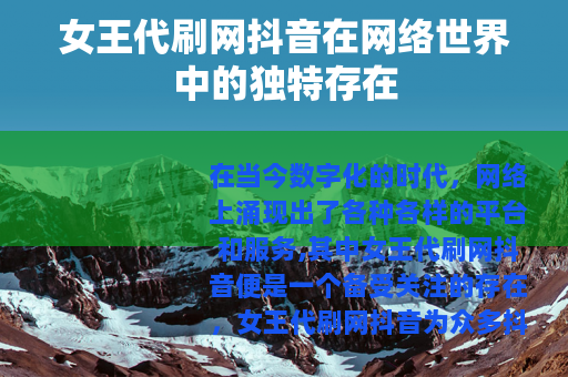 在当今数字化的时代,网络上涌现出了各种各样的平台和服务,其中女王代刷网抖音便是一个备受关注的存在。