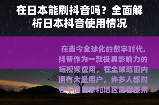 在当今全球化的数字时代,抖音作为一款极具影响力的短视频应用,在全球范围内拥有大量用户,许多人都对在不同国家和地区能否使用抖音充满了好奇,其中一个常见的问题就是:在日本能刷抖音吗?