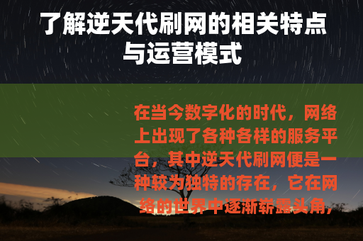 在当今数字化的时代,网络上出现了各种各样的服务平台,其中逆天代刷网便是一种较为独特的存在,它在网络的世界中逐渐崭露头角,吸引了不少人的关注。