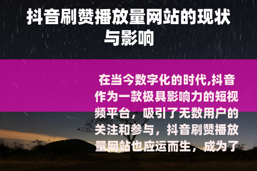 在当今数字化的时代,抖音作为一款极具影响力的短视频平台,吸引了无数用户的关注和参与,抖音刷赞播放量网站也应运而生,成为了一个备受瞩目的现象。