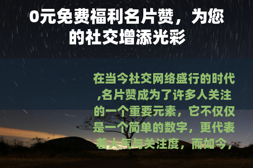 在当今社交网络盛行的时代,名片赞成为了许多人关注的一个重要元素,它不仅仅是一个简单的数字,更代表着人气与关注度,而如今,0元免费福利名片赞的出现,为广大用户带来了意想不到的惊喜。