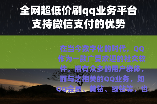 在当今数字化的时代,QQ作为一款广受欢迎的社交软件,拥有众多的用户群体,而与之相关的QQ业务,如QQ会员、黄钻、绿钻等,也备受用户关注,出现了一些全网超低价刷QQ业务的平台,并且支持微信支付,为用户带来了新的选择和便利。