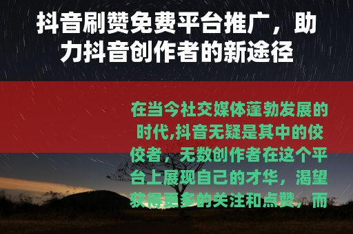 在当今社交媒体蓬勃发展的时代,抖音无疑是其中的佼佼者,无数创作者在这个平台上展现自己的才华,渴望获得更多的关注和点赞,而抖音刷赞免费平台的出现,为创作者们提供了一种新的推广方式。