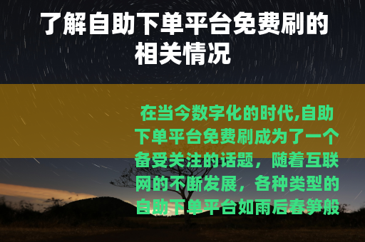 在当今数字化的时代,自助下单平台免费刷成为了一个备受关注的话题,随着互联网的不断发展,各种类型的自助下单平台如雨后春笋般涌现,其中一些平台声称可以提供免费刷的服务,吸引了众多用户的目光。
