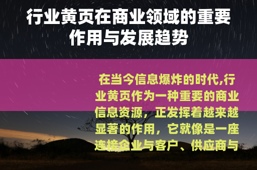 行业黄页作为一种重要的商业信息资源,在现代商业活动中发挥着不可或缺的作用,它为企业提供了市场营销的平台,为客户提供了便捷的采购渠道,促进了行业之间的交流与合作,随着科技的不断进步和市场的不断变化,行业黄页也在不断发展和创新,未来它将在商业领域中展现出更加广阔的发展前景,为经济的发展和社会的进步做出更大的贡献,无论是企业还是个人,都应该充分认识到行业黄页的价值,合理利用这一资源,实现自身的发展目标,在这个信息时代,行业黄页就像是一把开启商业成功之门的钥匙,等待着人们去发现和利用,它将继续在商业的舞台上扮演着重要的角色,助力企业腾飞,推动行业发展,为构建更加繁荣的商业世界贡献自己的力量。