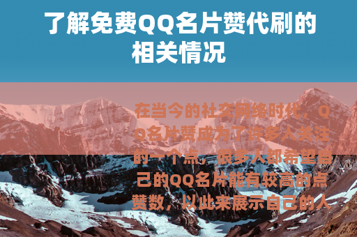 在当今的社交网络时代,QQ名片赞成为了许多人关注的一个点,很多人都希望自己的QQ名片能有较高的点赞数,以此来展示自己的人气和社交活跃度,而免费QQ名片赞代刷服务也随之应运而生。
