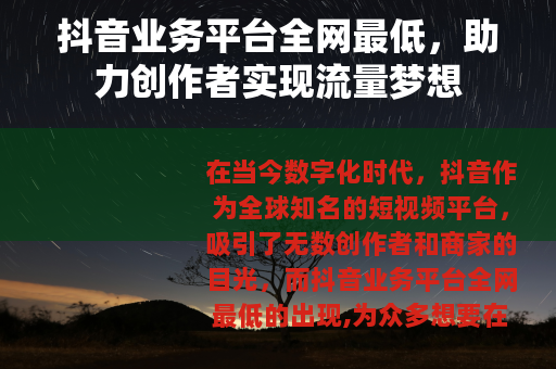在当今数字化时代,抖音作为全球知名的短视频平台,吸引了无数创作者和商家的目光,而抖音业务平台全网最低的出现,为众多想要在抖音上崭露头角的人提供了一个极具性价比的选择。