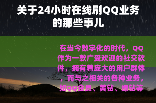 在当今数字化的时代,QQ作为一款广受欢迎的社交软件,拥有着庞大的用户群体,而与之相关的各种业务,如QQ会员、黄钻、绿钻等,也备受用户关注,24小时在线刷QQ业务的现象逐渐兴起,成为了不少人热议的话题。