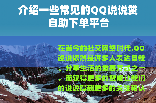 这些QQ说说赞自助下单平台为广大QQ用户提供了一种方便快捷的方式来增加说说的人气和关注度,用户可以根据自己的喜好和需求选择适合自己的平台,通过购买赞来让自己在QQ社交圈中更加活跃,让自己的心情和生活点滴能得到更多朋友的点赞和支持,在使用这些平台时,也要理性对待,不要过度依赖,毕竟真实的互动和有价值的内容才是社交网络的核心所在,希望大家都能在QQ说说的世界里,通过合理利用这些平台,收获更多的快乐和友谊,让自己的社交生活更加丰富多彩。