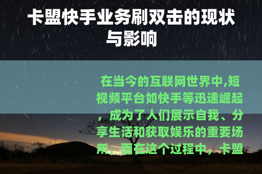 在当今的互联网世界中,短视频平台如快手等迅速崛起,成为了人们展示自我、分享生活和获取娱乐的重要场所,而在这个过程中,卡盟快手业务刷双击的现象也逐渐进入了大众的视野。