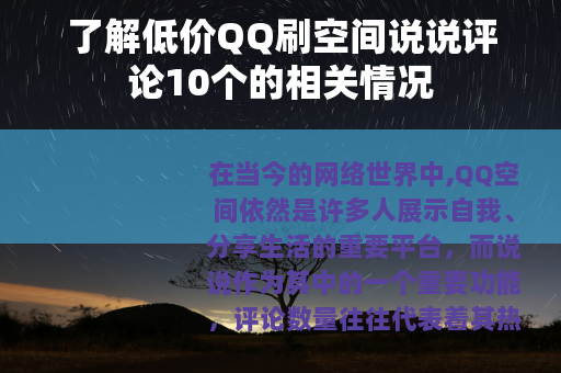 在当今的网络世界中,QQ空间依然是许多人展示自我、分享生活的重要平台,而说说作为其中的一个重要功能,评论数量往往代表着其热度和受关注程度,市场上出现了低价刷QQ空间说说评论10个的服务。