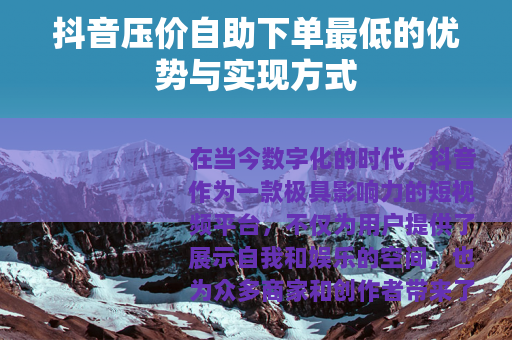 在当今数字化的时代,抖音作为一款极具影响力的短视频平台,不仅为用户提供了展示自我和娱乐的空间,也为众多商家和创作者带来了无限的商机,抖音压价自助下单最低这一特点,正逐渐受到越来越多人的关注和利用,为用户在抖音平台上的发展和运营提供了有力的支持。