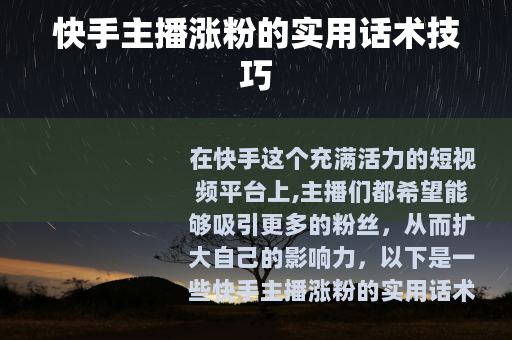 在快手这个充满活力的短视频平台上,主播们都希望能够吸引更多的粉丝,从而扩大自己的影响力,以下是一些快手主播涨粉的实用话术技巧,帮助你在快手上更好地发展。