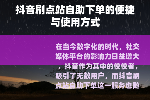 在当今数字化的时代,社交媒体平台的影响力日益增大,抖音作为其中的佼佼者,吸引了无数用户,而抖音刷点站自助下单这一服务也随之兴起,为许多用户提供了一种独特的体验。