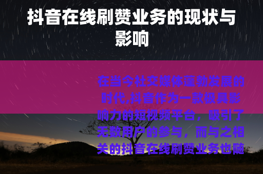 在当今社交媒体蓬勃发展的时代,抖音作为一款极具影响力的短视频平台,吸引了无数用户的参与,而与之相关的抖音在线刷赞业务也随之兴起,成为了一个备受关注的现象。